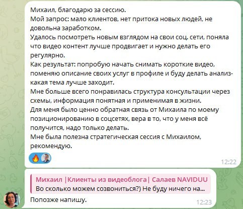 После стратегической сессии у тебя появится понятный план действий, как через 2 месяца после внедрения начать зарабатывать с блога от 100 000 руб. и потом дойти 1 000 000 руб. Ты поймешь, как получать результат в деньгах, подписчиках, реакциях зрителей, количестве сессий и отзывов от довольных клиентов.